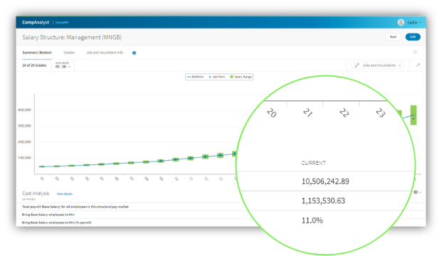 Forecast Costs: Quickly understand how much it would cost to bring employee salaries to the market rate. Forecast costs associated with changing structures or adjusting individual employee pay.