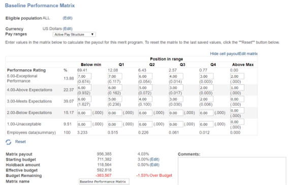 Advanced Merit Modeling: Model merit matrices based on performance and comp-ratio, range penetration, or market index.