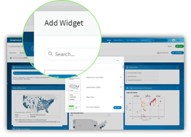CompAnalyst® streamlines the pricing process and delivers critical insights that keep you competitive in today's talent market. CompAnalyst's dashboard is fully customizable so you have the data you need at your fingertips.